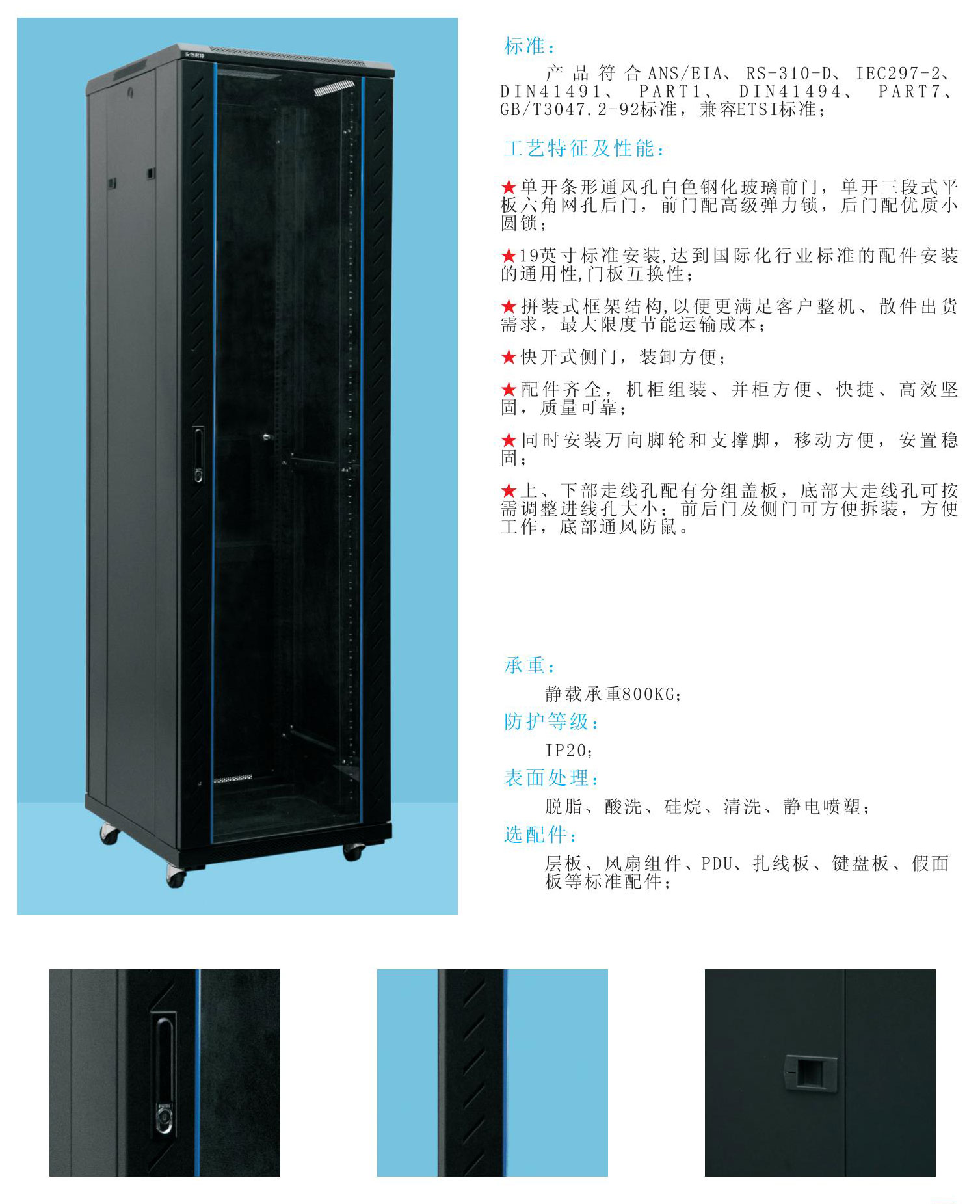 選配件:層板、風(fēng)扇組件、PDU、扎線板、鍵盤板、假面板等標(biāo)準(zhǔn)配件;